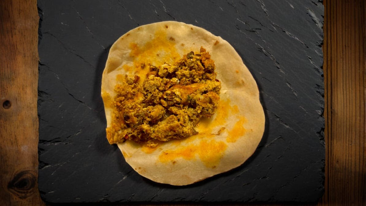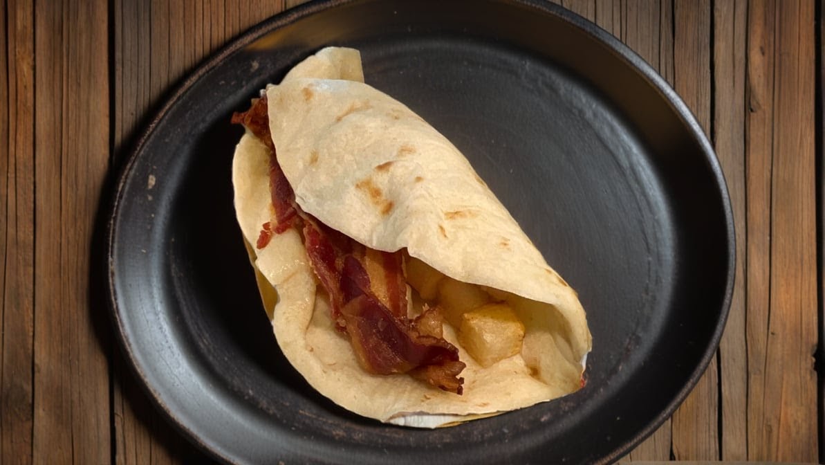 Diced potatoes, gently seasoned and cooked, nestled in a soft tortilla with chorizo and salsa ranchera